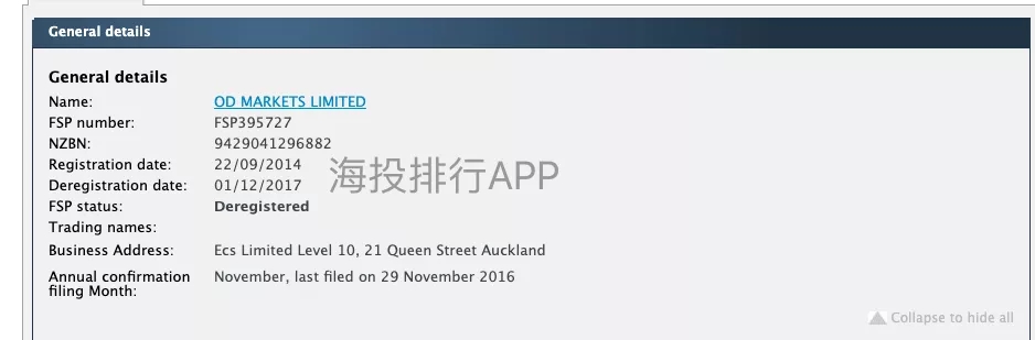 据海投排行资料显示,ODMarkets成立于2014年,同年申请了新西兰FSP金融服务公司,但是于2017年注销了金融服务资质。