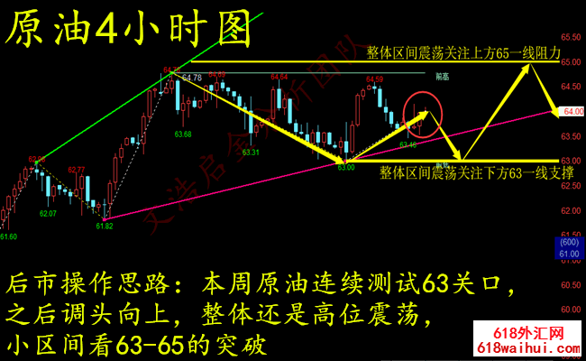 2、上方64.6-64.8一线做空,止损0.4美金,目标看63.6-63.8一线;