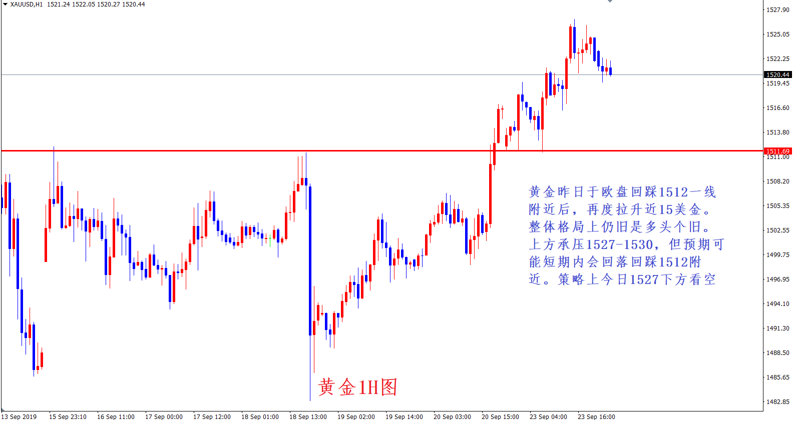 昨日回顾 昨日黄金自早盘1512附近开始上涨,盘中一度冲高后于欧盘回落至1512一线。在再度回踩后,美盘大涨近15美金至1527附近随后跌落。目前金价回调交投于1520附近一线。 策略分析 周一黄金延续上周五尾盘涨势,收得三连阳。昨日黄金在回踩1512一线后再度获得买盘的支撑,一举突破1520后。目前多头走势仍旧强劲。但上方1527一线为本轮行情最为重要的压制位,也是9月份非农反弹承压位置。预期会有较强压制,阻碍本轮多头进行的涨势。另一方面,本轮上涨自1483一线上周四美联储利率决议后,到目前上涨近40美金,仍旧未出现调整。很可能这一波调整将到来。今日策略上看黄金承压1527后,今日可能将走低至1512,昨日支撑附近。思路上以逢高看空为主,具体点位盘中内部公布。