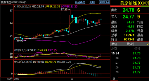 美原油从技术面,日线图上来看,布林带三轨逐渐向下运行,原油价格运行在布林带中轨附近,均线收金叉上扬,短期存在反弹需求,上方重点关注27.2一线阻力,下方重点关注20.5一线支撑;美原油从四小时图上来看,布林带三轨逐渐发散,原油价格运行在布林带上轨附近,均线收金叉上扬,短期上方关注25.9-26.4一线阻力,下方短期关注22.7-22.2一线支撑。综合来看,今日短线操作思路上刘铭.诚个人建议以回调做多为主,反弹高空为辅,上方关注26.5-27.0一线阻力,下方关注23.0-22.5一线支撑。更多实时喊单,解套,策略,分析,添加レ,亻言zdmj868获取!