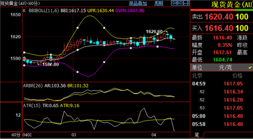 现货黄金从4小时来看,区间震荡;金价近期维持在1575-1645区间震荡,若该区间不能突破,可维持高抛低吸,或是等待决定性突破指引。上方方面,先关注上方1630美元一线,这是布林带上轨处,对价格上行有一定阻力,上破后重点关注1645美元一线,这是震荡区间的上轨,此前经过多次测试,具有较强的参考价值,若上破,进一步打开上行空间,阻力位上看前期高点1703。