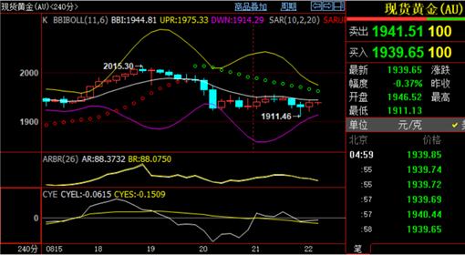 周六(8月22日)本周金价震荡回落,当周金价最高触及2015美元,最低跌至1911美元,金价当周在接近100美元的宽幅空间巨幅震荡。当周金价下跌4.64美元,跌幅0.24%,收盘报1940.48美元/盎司。黄金从日线级别上来看,高位震荡;布林带收口,金价徘徊中轨附近。MACD死叉、绿柱动能强劲,KDJ粘合、指数位于50下方。金迎从技术面看,黄金短线偏震荡走低。下方初步支撑先留意1925.00附近,这先后在本周三、周四被测试;强支撑重点留意1900关口。若跌破将提振市场看空情绪,金价可能回踩8月12日低点1863。上行方面,先留意日内高点1955.93;若上破则留意20日均线1976.00,进一步阻力位上看周二高点2015.59。