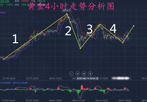 先从4小时线来看一下,目前收一个大阴柱,上面留下了深深的一根上引线,而且已经击穿了布林带的中轨的支撑位置,金价处于布林带的中轨和下轨之间,布林带开口比较平整,稍微向下拐头但是不明显,还有上冲上来的可能,目前从波浪理论来看,目前运行的是第3浪,如果下方的支撑1906再次撑住,几次试探不破的话,那么1906这里还是空头4浪的调整的一个终点,从新开始进一步的反弹,今天是由于消息面的刺激,鲍威尔发表的言论,两面派,模拟量可,美国的通货膨胀率未来到底是一个怎么样的走势,美国的国债收益率如何,导致了行情大幅的回落,从下方的MACD技术指标来看,目前有轻微拐头的迹象了,上方的阻力我们还是先关注1957一线,布林带的上轨有一定的压力,上方的强压在1976一线需要关注,从小时线来看金价有所反弹,已经反弹至布林带的下轨上方了,下方的MACD指标并没有拐头的迹象,依旧是一个空头的趋势,综合上述总结,只要1906没有破位,那么就会还是在走3浪的趋势,上方阻力1975,下方的支撑1906,操作上以老师的实仓指导为主。
