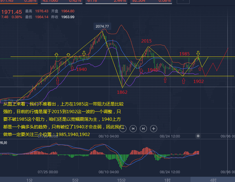 目前从日线级别来看,只从1862反弹2015以后,黄金开始宽幅的震荡,区间围绕1902-1976震荡,从图上不难看出整个趋势是一个多头上涨的趋势,低点在不断的上移,第一次的低点在1670,第二次低点1862,第三次低点1903,下方的空间还没有打开,支撑很强,这一个月在下旬的时候金价有两次触及了1902附近,但是不太尽人意,快速反弹上去至1966-1976一线,上一周的行情基本就是围绕这个区间,这周的话我们就需要重点关注,1902,1976;从4小时来看布林带的上轨拐头向下,中轨和下轨还是向上运动,从下方的MACD指标来看,红色动能运动轨迹已经开始拐头,需要注意,红色动能柱减弱,不能盲目的做多,短期的下方支撑1940,多空的分界点。目前交易分为两种:需要关注1985,1940,1902,右侧交易:强势突破1985挂多,回踩1940多,止损5美金,目标上看15美金,左侧交易,1985承压,空进场,1940破位,追空,止损5美金,目标看15个点。