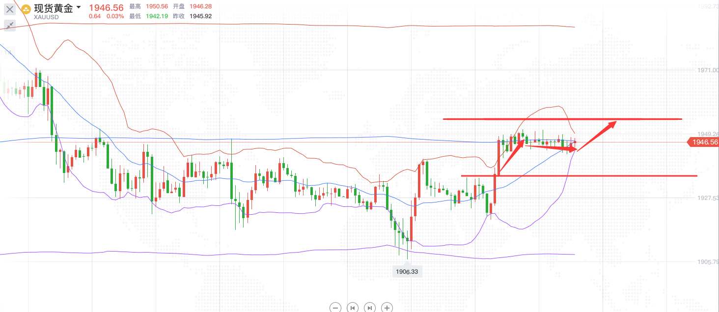 国际黄金行情分析:黄金最近行情反复,周二价格破底到位1906一线,随后价格回升,到现在已经算是V型收复周二的跌幅。黄金近期区间震荡,洗盘之后,昨晚最终走出区间,多头强势,形成阶梯式上行格局,欧盘探底1920后走强,美盘黄金自1920开始低位反弹,快速拉升,强势上涨近30美金,突破1940后回踩续涨,边涨边调,步伐稳健,动能强劲,逼近1950关口。黄金此次上涨走出单边行情,是受美元指数大幅回撤支撑。从技术面来看,黄金上方阻力在1960的趋势线压制一线。小时线级别,K线此前一直受到均线压制,美盘上穿均线,完成多空转换,均线系统1930一线构成强势支撑。综合来看,黄金今日短线操作思路上周品源个人建议以回调做多为主,反弹高空为辅,上方短期重点关注1960-1965一线阻力,下方短期重点关注1940-1935一线支撑,在投资方面有操作上面的问题可以添加笔者交流,态度决定一切,细节决定成败。文章只能给出一个暂时的方向和想法,至于具体的进场点和解套时机,请关注周品源的官微:zpy2357将实时给出。。