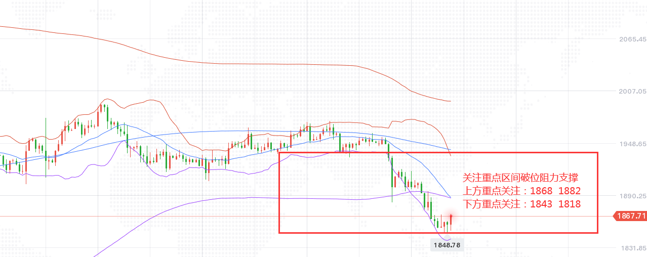 黄金昨日下探回升收盘小阳线,惯性的创新低至周线中轨1848附近止步延续弱势,尾盘时段反弹收复亚盘起跌口1868.80.最高反弹至1877.最终日线收盘小阳线。三连阴之后接收小阳线,并不是反转信号,只是当日的极弱延续性不足,打破极弱。走为震荡修正,但整体趋势依旧看空不追空,日线大阴线三阴下挫,小阳反弹也是正常的修正区域,只是昨日触及到支撑后略有停顿。伴随了一定的反弹修正,而周初的下跌是直接单边式的弱势下行,并没有停顿反弹收盘。这样隔日就会继续延续弱势,昨日小阳反弹,今日周线收官之作,可能伴随反弹再承压下跌。或者整理之后再延续下跌,此位只是一个小阶段性的停顿修正。并非止跌,所以抄底还言时过早。周线收盘争夺一下中轨的得失。失守中轨下周继续跌。反之守住的话,短线会先进行反弹修正,再蓄势下破,目前K线结构而言。后市破位的机率还是比较大。故主思路维持高空。