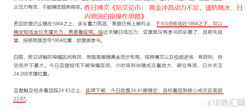 白银,昨日的交易同样是精准大胜!早间博文强调,银价小时级别实体下破窄幅震荡区间底部24.43有效,午后注意价格能否回归支撑之上,若持续压制则进一步看空,银价欧盘测试24.43受阻回落,博文策略延续下破24.41跟空,目标直接看到下方核心成交区底部核心成交区底部23.87,大幅止盈!