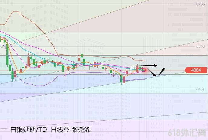 白银TD:银价自昨日晚间开于4941元/千克后,也是先行冲高再转回落,延续至今日周五白盘,连续3日产生长上影线,暗示上方压力较大,有进一步回撤风险,不过主图上,10日均线支撑较强,几度回落触及此处又展开反弹,故此短线仍可据此看反弹多。上方则关注其压力,整体震荡对待。