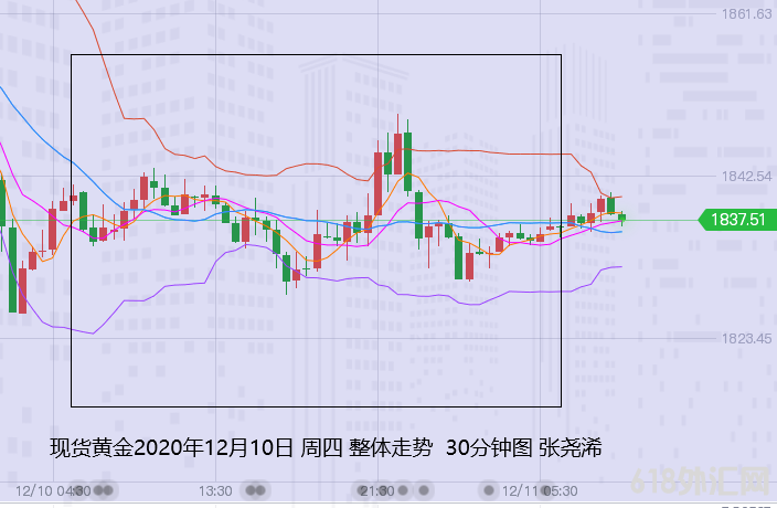 上交易日周四(12月10日) 国际黄金伦敦金回落止步,但仍震荡收阴,暗示回撤压力仍在。具体走势上,金价自亚市早盘开于1840.29美元/盎司后,受到10日均线的支撑和布林中轨的压力,而整体处于1834-1843区间震荡。随后欧盘开盘后,因英国无贸易协议脱欧预期增强,英镑大幅走弱,而令金价即触及日内低点1828.59美元。