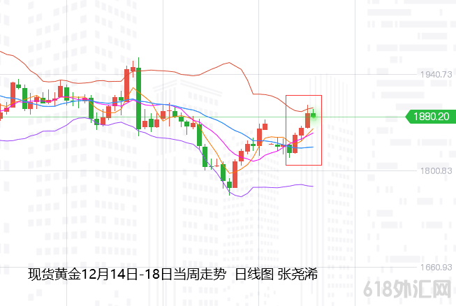 黄金市场交易日(12月14日-18日)当周;国际黄金伦敦金再度冲高收阳,站上30周均线,但未触及或突破中轨压力。