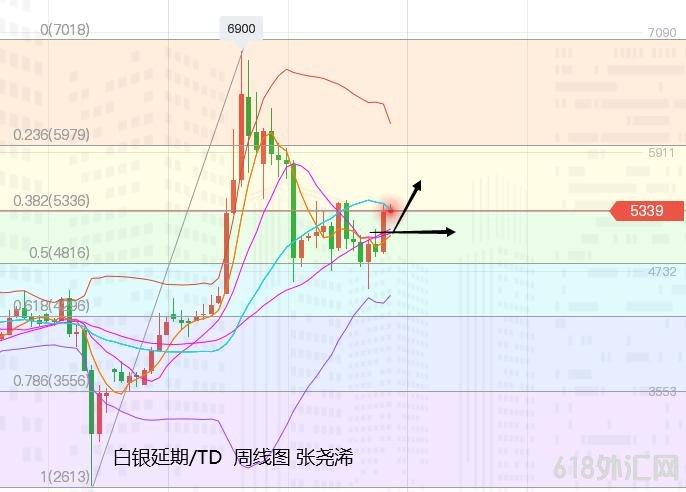 白银TD:银价上周也是大幅收阳,自开于4934元/千克,最低触及4907元/千克,最高录得5382元/千克的布林带中轨目标位,收于5331元,周振幅475元,收涨397元,幅度8%。本周五晚间也是相对下周先行平开,但波幅较小,虽一度冲高至5396元,但之产生回撤,并收于5339元,上方阻力较强,但指标上,KDJ及MACD整体保持看涨信号强劲,暗示看好突破并上行。