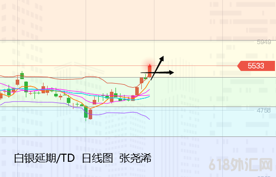 白银TD:银价上周也是大幅收阳,自开于4934元/千克,最低触及4907元/千克,最高录得5382元/千克的布林带中轨目标位,收于5331元,周振幅475元,收涨397元,幅度8%。