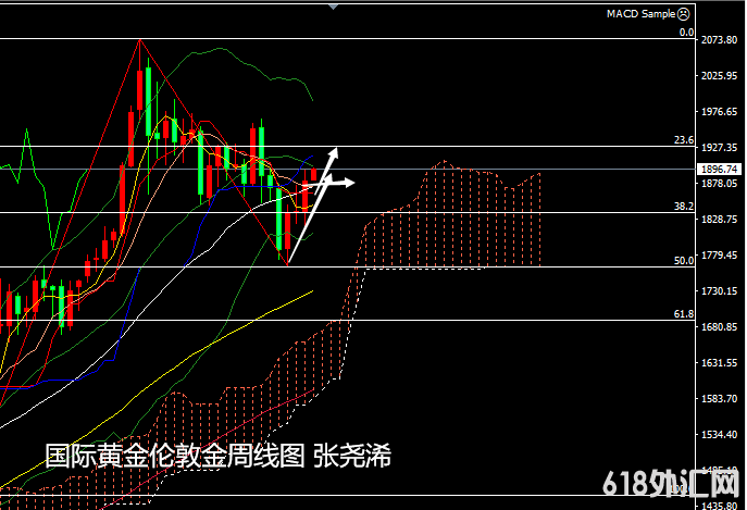 周线级别,金价上周收阳,连续三周走高,本周开盘再度走高,虽目前临近中轨阻力附近有所遇阻,但指标上空头信号不断减弱,看涨信号也不断增强,暗示看好突破中轨附近压力1900美元。