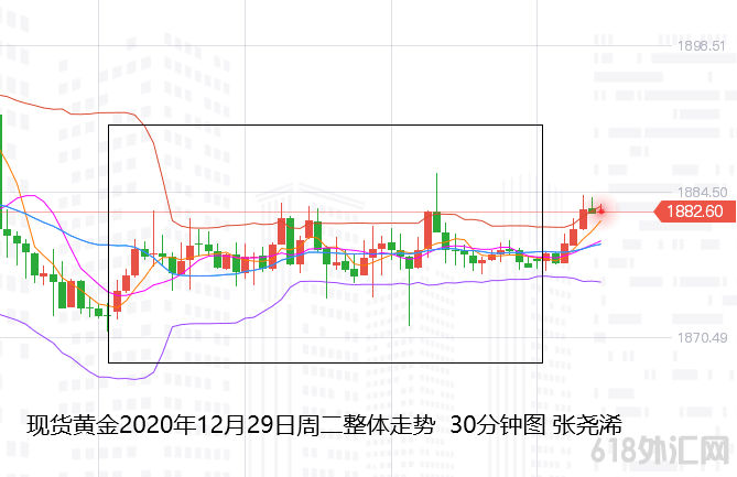 上交易日周二(12月29日);国际黄金伦敦金冲高回落且收阳。走势上,金价自亚市早盘开于1873.43美元/盎司后,受到技术支撑以及美元走低的影响,先行走高,不过受到周一的抛压影响,以及美国参议院共和党人阻挠2000美元个人纾困补贴法案,抑制了金价进一步上涨,令其亚欧盘维持在1883-1874之间运行。延续至美盘时段,振幅加大,先是美元从日低点反弹,道指等高开高走打压金价走低录得日内低点1871.67美元,后又因道指等回落转阴,美元再度承压,支撑金价反弹录得日内高点1886.10美元,终又回落收于1878.15美元,日振幅14.43美元,收涨4.72美元,幅度0.25%。