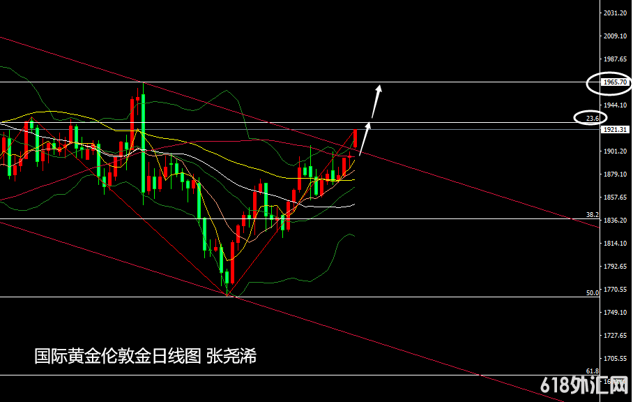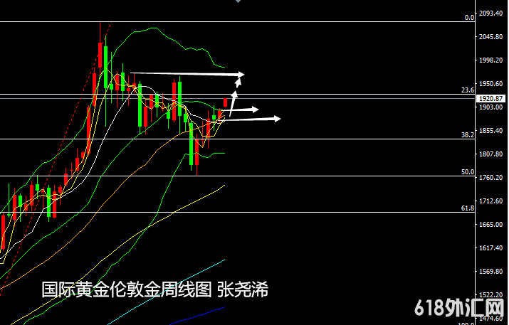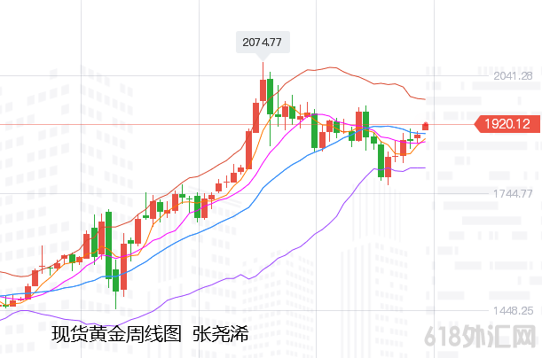 观点上,张尧浠认为:本周虽高开高走,且在中轨上方表现运行,也初步站上1900的关口,但上方仍然有较强的阻力存在,1970美元以及2020美元仍是强大的压力位,多头触及随时都有大幅回落并跌破1700美元关口的风险。但千七关口下方也正是再度长期看涨的机会。目前我们只需要关注这波动力的目标点和关键阻力的突破情况即可。