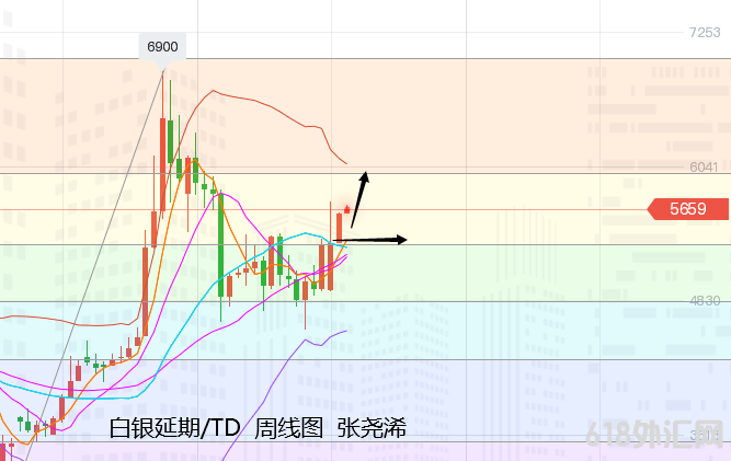 白银TD:银价上周大幅上涨收阳,站稳周线中轨上方,走势上,自开于5353元/千克,最低触及5340元,最高触及5618元,收于5617元,周振幅278元,收涨264元,幅度4.9%。