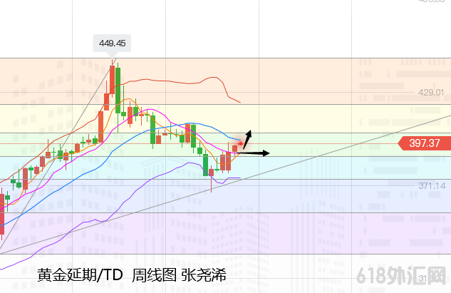 黄金TD:金价上周探底回升收阳,走势上,自开于392.35元/克,最低触及388.90元/克5日均线支撑展开反弹,最高触及396.30元,并也收盘于此。