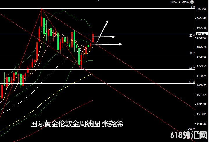 周线级别;金价本周直接高开至中轨压力上方并高走延续,增加了其上周突破30周均线的看涨预期。目前虽有回落,但仍处于强势的看涨预期中,主图上,长期均线持续多头排列,下方各级均线也集体表现支撑,附图指标KDJ金叉向上运行保持,MACD空头信号持续缩减,暗示仍存在的进一步走高的预期。下一目标仍然是1966-70美元。但需要维持在23.6%回撤线处1928美元/盎司上方是继续看涨情景的首个条件。跌破则直接看回补缺口至下方关注1895美元以及1885美元附近支撑再度跟进看涨。