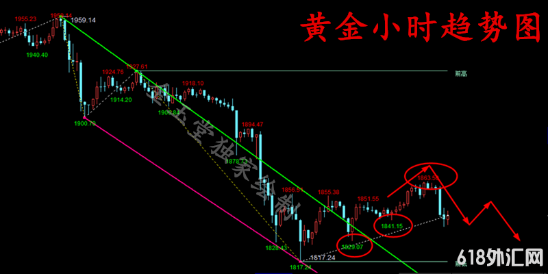 金价目前从1860附近快速下跌,已经下跌到日内起涨点1841一线,这一波跳水比预期来的还要猛,该点位依然存在一定支撑,如果说晚间再次跌破1841-1842一线,那么日极有可能再次走低至昨日美盘低点1830附近,这是二次比较理想的接多点位。