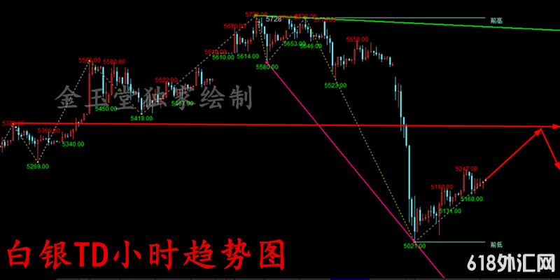 白银td自昨日晚间开于5132元/千克后,行情走势也是探底后回升,延续至今日周二白盘,保持其回升转阳行情,不过日线附图行情指标KDJ及MACD仍保持看空信号,因而预计反弹会在阻力位置或附近产生回落,故此看涨可至阻力位后再转空。