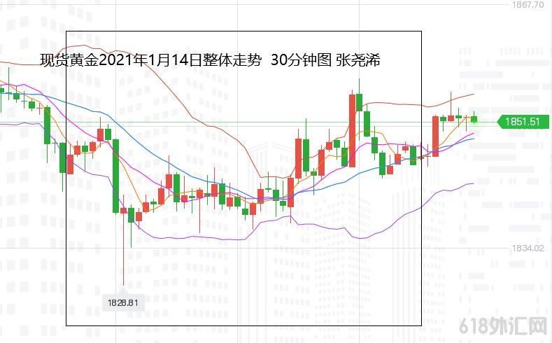 上交易日周四(1月14日)国际黄金伦敦金较前两日走出大幅震荡的十字星,微收涨。走势上,金价自亚市早盘7点开于1845.15美元/盎司后,先行暂短走高至1852美元后,又在又在10点30分左右,受到美国10年期国债等快速的拉升影响,而迅速走低至200日均线支撑,且录得1829.77美元日内低点;