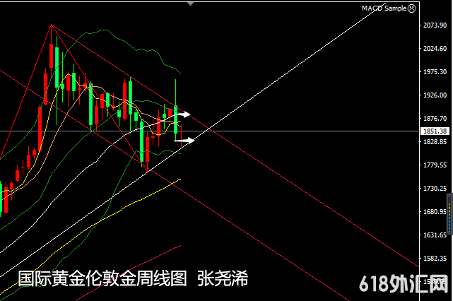 周线级别:金价暂时受到1451美元而起的支撑线展开反弹,虽附图指标仍处于空头信号,但也处于缩减阶段,主图上与2075美元而下的压力线组合成三角趋势,也暗示将有一定的震荡预示作用。依然关注其两边哪方先突破,目前走势转阳上行,暗示上行动能偏强,如本周收取阳线,则暗示下周延续看涨,并进一步迈向至1880美元附近,突破上看1928美元。如回落,下方重点支撑在1820美元,跌破下看1788美元。