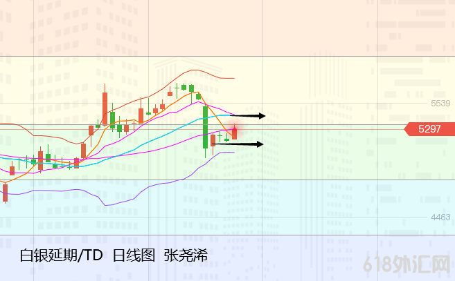 白银TD:银价自昨日晚间开于5200元/千克后,即表现走高,并延续至今日周五白盘最高触及5340元,目前仍保持强势,虽有回落,但力度有限,附图指标上,KDJ及MACD空头信号明显减弱,暗示仍看好进一步走高。