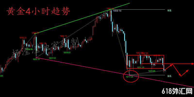 1、目前4小时连续阴线下跌,因此我们下周开盘短线看反弹在1834上方前期支撑点达到后参与空单;