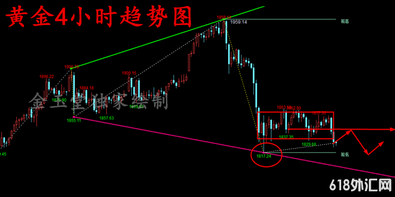1、目前4小时连续阴线下跌,因此我们下周开盘短线看反弹在1834上方前期支撑点达到后参与空单;