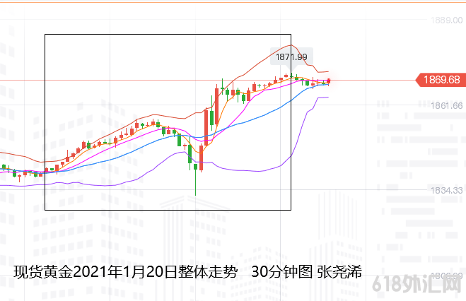 至美盘开盘后,欧洲主要股指全线走高并收涨,英镑和加元兑美元上涨至两年多以来最高水平打压美指走低。虽拜登就职对美国三大指数助力刷新历史高点收涨,但更多的刺激预期增加,打压了美指,同时市场也产生了卖事实的影响,这使得金价意外走高,并再度展开反弹,再次到达晚间给出的反弹目标位1866美元,且突破录得日内高点1871.53美元,终收于1871.24美元,日振幅38.98美元,收涨31.25美元,幅度1.7%。