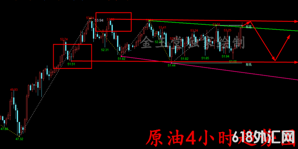 四小时来看,布林道开始收口,早间在刺破下轨后持续反弹,当前KDJ随机指标三线开口向上,MACD快慢线初步结成金叉,绿能殆尽转换为红能,暗示原油将进一步反弹,但是原油整体仍然处于上下轨之间区间震荡,金玉堂仍然认为短线仍可在区间内做震荡,下方关注51.5-52区域支撑,上方关注53.8-54区域阻力!今日白天操作金玉堂建议反弹做空为主,回撤低多为辅。