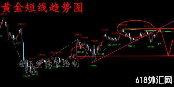 第三,小时线级别,周五美盘探底拉升,凌晨支撑1809一线,也是突破短期下跌通道后,回测确认的支撑点,今日早盘行情先行反弹,压制1820阻力下回落也是正常,它是一个短期开跌口;那么早盘冲高回落后,短线就横盘不动,那么就需要留意下方几个支撑点:一个是1808-1807早盘低点,一个是1803,属于隔夜美盘反弹至今日早间高点回测618支撑,最后一个是短期1785、1793所形成的趋势支撑点1800,这三个点,企稳都具备支撑低多;而阻力方面,1820,再往上就是1827和1830以及1838,价格围绕支撑和阻力之间,要展开震荡整理,高抛低吸对待;