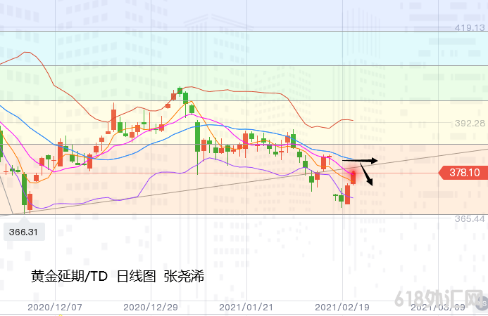 黄金TD:金价自昨日晚间开于374.92元/克后,延续周一走势再度反弹,至今日周二白盘,继续保持上涨,附图指标上,KDJ保持金叉向上,MACD也趋于看涨,暗示本周仍继续看涨,不过主图上方面临均线阻力位,故此观点上,前半周看涨,后半周以阻力做空。