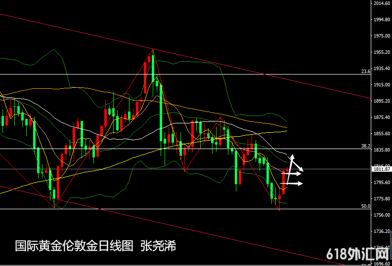 日线级别;金价本周自受到1760美元附近的多点支撑展开延续性反弹,目前已再度站稳1800美元关口上方,这则为后市增加了其看涨力度和预期,指标上,附图指标整体保持看涨信号,主图走势也有进一步上探至中轨线1820美元附近的空间和力度,另外30日均线1830美元也近在咫尺,故此多头仍有看涨的空间,如需做空,也需等待至此阻力位附近稳健进场,如激进操作,则需跟随张尧浠实仓信息。