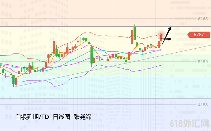 白银TD:银价自昨日晚间开于5647元/千克后,微幅走低触及5日均线支撑附近的5604元后展开反弹,延续至今日周二白盘,保持强势,相比金价的看涨力度和抗跌力度都较强,指标上,整体保持强势,看涨预期加大,本周仍偏向走高。