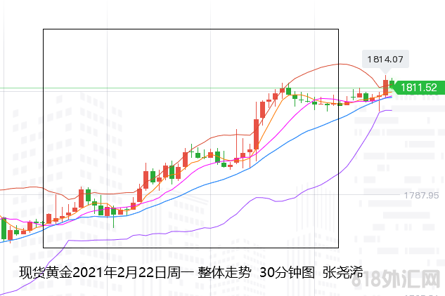 上交易日周一(2月22日):国际黄金伦敦金延续上周五探底回升之力较大幅反弹收阳。走势上,金价自亚市早盘开于1782.03美元/盎司后,即走高,美元指数反弹受阻,连续第三天走低,对其产生支撑,并于午间十二点推动金价触及1890美元附近后,受到持强的美国国债收益率而有所回落,并录得日内低点1780.60美元,但之后走势再度转强,市场买盘强劲,一直延续到晚间美盘时段,虽有较大回撤的振幅波动,但在美国1.9万亿美元的经济刺激计划将在周末前通过的市场预期下仍保持强势,并录得日内高点1812.35美元,终收于1809.54美元,日振幅31.75美元,收涨27.51美元,幅度1.54%。