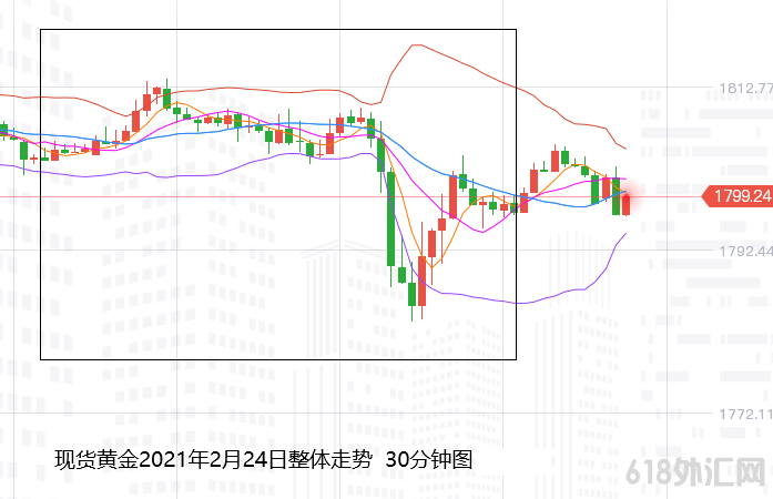 张尧浠:鸽派言论难敌高涨国债、金价反弹空白银偏看涨 上交易日周三(2月24日):国际黄金伦敦金较大幅回撤后再V型反弹且微收跌。走势上,金价自亚市早盘开于1805.35美元/盎司后,先行走高并录得日内高点1813.51美元,随后金价开始遇阻中轨压力回落,不过市场看涨情绪也较强,因而一直延续到晚间美盘十二点前,1800美元都展示出了强大了的支撑力度。 但此之后金价突遭下行,因好于预期的新屋销售数据推高了美国10年期债券收益率,自2020年2月以来首次触及1.4%,美指也大幅走高近400点,而对金价造成打压,并于一个半小时左右下跌超25美元,录得日内低点1783.58美元。 不过,随后鲍威尔再度重申美国利率将保持在低位,并继续购买债券以支持美国经济的鸽派言论。推动金价又就此反弹逾20美元,重回1800美元上方,最终收于1804.68美元,日振幅29.93美元,收跌0.67美元,幅度0.037%。