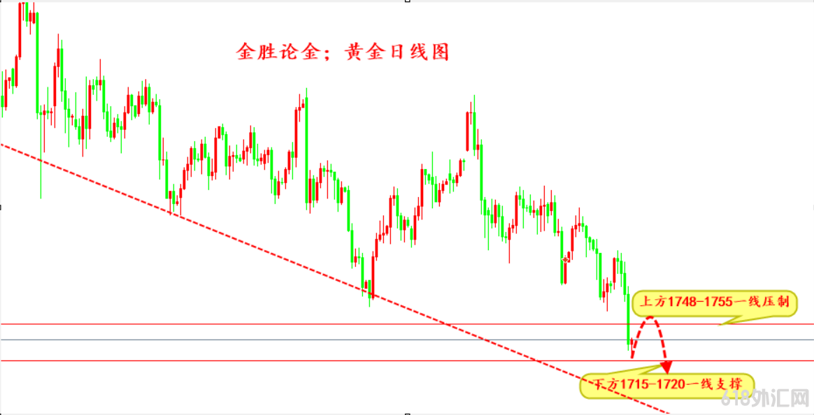 上周一一路爬升,周二亚盘触及1815.88美元/盎司的周高,之后开始震荡下行,周三美盘前突然急挫,一度跌至1790美元下方,周四又暴跌近40美元。周五现货黄金跌穿1760美元关口,美盘初跌势扩大,跌破1750、1720美元两大关口,创去年6月17日以来新低至1717.34美元/盎司,最终收报1734.04美元/盎司,跌幅2.06%,本月迄今为止,金价下跌了113.61美元,跌幅6.15%。创出2016年底以来最大单月跌幅,实际上,因债券收益率飙升,黄金价格已连续第二个月下跌。 现货黄金;操作思路上金胜建议顺势反弹做空为主,多为辅,