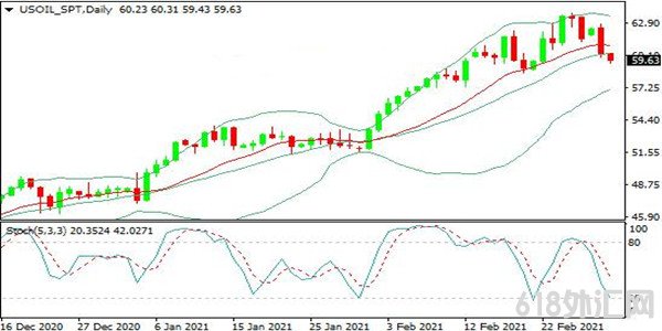 美原油周一(3月1日)亚市盘初高开高走,一度上至62.896美元/桶日内高位,但仅触及日内高位后短线持于62.5美元附近徘徊后展开下挫;直至美盘,有消息称,哈萨克斯坦2月石油产量增加了8%,超过了欧佩克+的配额,另外市场预计欧佩克+本周将考虑从4月起适度放宽产量限制,原油扩大跌幅,刺破60.0美元关口,盘中最低下至59.94美元/桶,截止收盘,原油自日内低位回升,收复60.0美元关口,收于60.19美元/盎司。