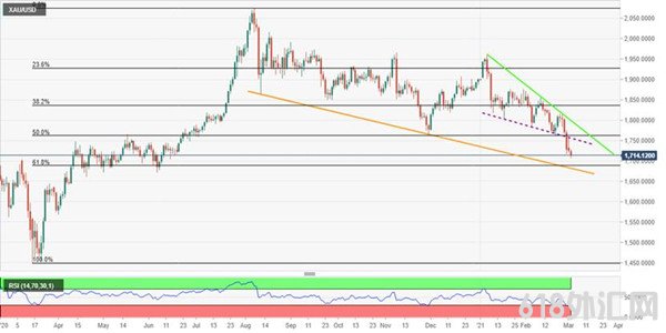 尽管相对强弱指数(RSI)状况持续考验黄金空头,但如果金价持续突破之前的关键支撑位,将进一步走低。