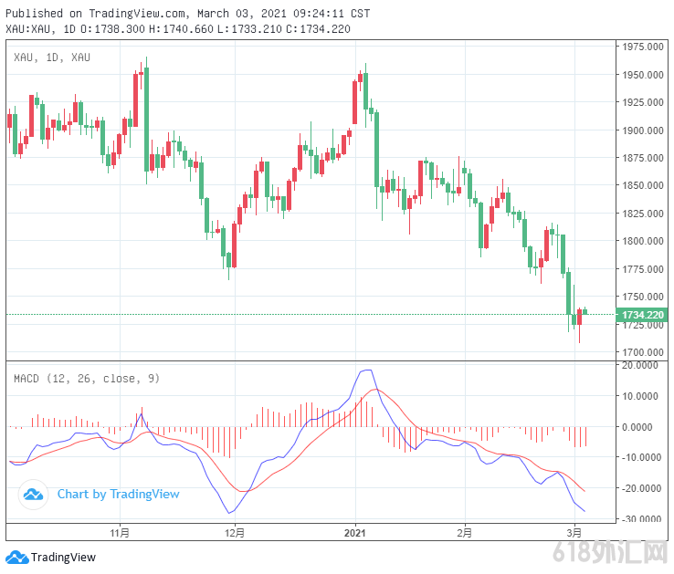 为确保刺激法案快速推进,民主党让步了,决定放弃15美元最低时薪的提案。在近期债券市场动荡不安的背景下,市场对于美联储可能会尽快调整政策的预期却越来越高。周二(3月2日)亚市午后,现货黄金重回1720美元/盎司上方,现报1723.1美元,日内跌幅收窄至0.07%。周二现货黄金再度下探1710关口,黄金多头开始押注回调目标,1700出现密集挂单暗示黄金或将继续下破!美元走强也是今天走势背后的一个因素,但黄金前景已经相当不稳定了一段时间。上周金价突破11月低点并没有带来任何帮助,因为这对向1,700美元的目标迈进几乎没有任何阻碍。黄金的前景仍将很大程度上依赖于收益率,而这一点最近并没有对黄金有利。此外,自去年9月以来,黄金ETF的仓位已经下跌了五个月,目前仍在继续调整。