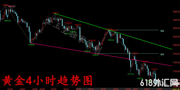 从趋势形态上看,价格下方的支撑是1717-1707的趋势线连线支撑,在1687位置,行情也恰恰是在该位置企稳反弹。上方的阻力则是1759-1740-1723的下降趋势线连线阻力,在1715-1720区域,是目前主要准备做空的点位。非农数据临近,短线先关注1686-1688的支撑与1715-1720的阻力,滞涨止跌可关注高空低多布局思路。若跌破1686,则看极弱势下跌到1670附近,注意在1670-1650区间企稳反手做波段多。