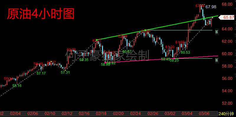 原油技术面分析:原油从技术面来看,MACD高位金叉,KDJ金叉。油价周一冲高回落,并录得长上影大阴线,因连续几日的大涨之后多头开始获利了结,但早盘市场看涨的情绪依然不减,投资者应继续以逢低做多的操作思路为主。周三凌晨有API原油库存数据出炉,将为市场指明方向。上方阻力继续关注各整数关口,下方初步支撑关注5日均线64.02,进一步关注2月25日高位63.38及10日均线62.99。中长线来看,油价单边上涨行情仍未终结,K线始终运行与上涨通道内,涨势有望延续,上方应该还有一定的上涨空间,若日内能再度顶破上轨压力,可能短线还有大涨机会。若陷入盘整,则多头将继续在通道内寻找上涨的机会。综合来看:今日原油操作思路上何子豪个人建议回调做多为主,反弹做空为辅,上方阻力关注65.8--66.0一线,下方支撑关注63.5-63.6一线。
