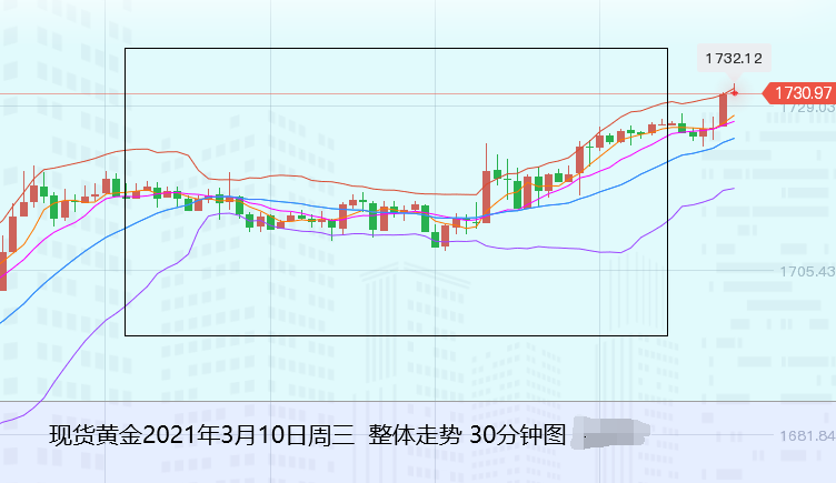 展望今日周四(3月11日):国际黄金开盘后,受到美国众议院最终批准了1.9万亿美元的刺激法案的影响,早盘再度刷新高点至1728美元附近,不过虽这是美国历史上规模最大的经济刺激措施之一,但市场对此已有消化,另外美债收益率和美指早盘自隔夜低位反弹则对金价涨势有所限制。另外,美国股市也大幅上涨,也打压黄金的避险需求,黄金多头需要予以警惕。金价若要重启涨势,仍可能面临一些困难和更多的看涨预期。