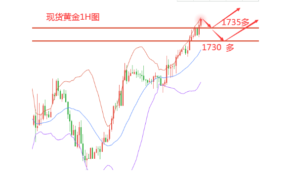 随着美元和美债收益率回落,现货黄金获得二日反弹上涨,昨晚美盘金价最高至1727一线,昨日金价最低在1708一线,昨晚美盘金价最终报收于1726附近。今日(周四)亚市金价开盘回落1723后开始持稳上涨,截稿前金价上涨至1735附近运行。