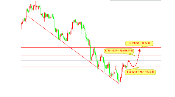 黄金从日线上来看,昨日黄金大涨收高,日线收实体阳柱,目前突破1700关口,站稳MA5日均线阻力位,加上KDJ指标的超卖修正需求,张老师看好多头进一步上涨,下一个阻力在MA10日均线1728附近,进一步关注MA20日均线1766附近阻力,不过值得注意的是MACD死叉仍在,绿能有节奏的维持放量不变,再加上盘面上各均线指标仍然呈现空头排列,所以反弹至此点位附近仍可做空,综合来看,黄金整体趋势仍偏空,但是短线有继续反弹需求,下方可关注5日线1700附近支撑看涨!四小时来看,昨日亚盘上涨,欧盘延续,美盘冲高后以高位震荡代替回落,目前金价突破布林带中轨下跌趋势线,运行于布林带上轨附近,短期均线支撑金价继续走高,KDJ随机指标金叉,MACD指标快慢线在零轴上方金叉运行,红色能量柱持续放量,上行势能有所增强,但是目前布林带开始走平,金价若迟迟不站上上轨继续上涨,则仍有回落走震荡的可能性,所以今日不要盲目追多,耐心等待回踩进场!综合来看,黄金今日短线操作思路上谢鸿远建议回调做多为主,反弹做空为辅,上方重点关注1745-1750一线阻力,下方短期重点关注1720-1715一线支撑。