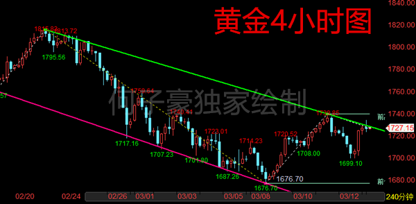 黄金技术面分析:黄金在周五美盘多次下探1700关口未能跌破,在尾盘直接V反转,突破了早盘,欧盘的下跌口位置,日K收出锤子阳线,所以今日亚欧盘行情继续看延续周五尾盘涨势即可。目前四小时MACD直接掉头,在0轴上方金叉,同时日线也是,周五尾盘探底回升直接V反转,所以毫无疑问,目前黄金看多看反弹。下方短线的顶底转换支撑在1720附近,也就是周五午后的下跌口位置,这里被突破后形成了目前的支撑位。下方强支撑在1713-14附近,这里是日线10日均线支撑,同时也是1676反弹到1739的0.382分割线支撑。上方压制在1729位置,突破继续看到1737附近。 综上所述,短线操作上何子豪建议今日亚欧盘行情回落关注1720附近的支撑,若不破直接参与多,若下破则等1713-14附近做多,统一目标看1729附近。突破继续看涨到1737位置!行情千变万化,需要获取每日在线实时指导操作策略及解套策略,可直接添加本人一对一指导.