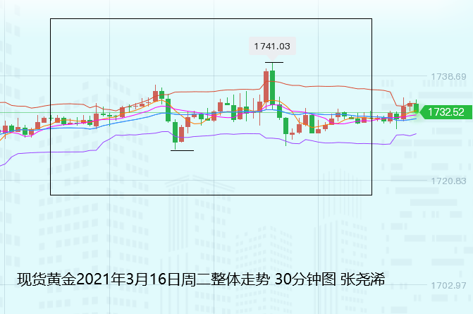 张尧浠:黄金反弹遇阻观望、待等美联储决议指引 上交易日周二(3月16日)国际黄金伦敦金冲高回落微收阴。走势上,金价自亚市早盘开于1731.44美元/盎司后,先行窄幅震荡攀升,于午间一点半左右触及1737美元遇阻回落,临近欧盘开盘前录得日内低点1726.03美元,也即5日均线支撑,随后欧盘开盘后走势再度震荡攀升,延续至美盘时段录得日内高点1740.83美元,也即布林带中轨阻力,后又连续回落,临近亚盘低点附近后,有所反弹,并再度窄幅震荡,收于1731.40美元,日振幅14.8美元,收跌0.04美元,幅度0.0023%。