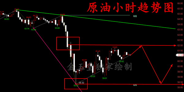 当前62位置是原油反弹的压力,短线可以依托此压力位置先空,区间震荡走势,高抛低吸操作!上方反弹62上方空,下方跌至59下方多!循环操作,复利收割!