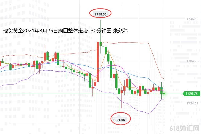 张尧浠:美元整体趋升、黄金关注30日线压力震荡做空 上交易日周四(3月25日):国际黄金伦敦金冲高回落转收阴。 走势上,金价自亚市早盘开于1733.75美元/盎司,受到隔夜反弹及中轨支撑的买盘影响,而震荡偏涨于11点整触及1739美元附近,但后因美指再度上涨而展开回落,延续至欧盘尾触及1725美元下方; 不过在晚间美盘开盘后,数据上的整体偏利多,以及连续出现两次的巨量买盘黄金期货合约的成交而推动走势加大反弹力度,一小时内即刷新亚盘高点走高至1745.10美元日高; 但不幸的是,买盘推动只一时,终又因美三大股指悉数转涨。美联储尧博斯蒂克浠言论通胀可能没有想象的那么严重。3月26日01:02一分钟内又遭6.12亿美元买卖盘打压,美国国债收益率上扬,美元触及四个月高位,削弱了黄金的吸引力。 快速且连续的回落,并于次日凌晨一点左右刷新欧盘低点录得日低点1721.75美元,后有所反弹,收于1726.39美元,日振幅23.35美元,收跌7.36美元,幅度0.42%。